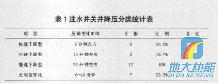 為確定合理降壓時間,在我隊30口注水井洗井過程中觀察注水井壓力隨關井時間的變化,以短時間(60分鐘)壓力出現直線段或相對直線段統計,歸納總結如表1所示的幾種類型:快速下降型、中速下降型、慢速下降型、無明顯變化型。 根據調查統計結果,來確定不同類型的關井降壓時間:快速下降型的井只需關井3 ̄5分鐘;中速下降型的注水井需關井10 ̄15分鐘;慢速下降型的注水井需關井降壓30分鐘,無明顯變化型的注水井可直接洗井(洗井時應觀察壓降的變化)。為此關井降壓的最佳時間應該是壓降變化趨于穩定的時間,較為合理。